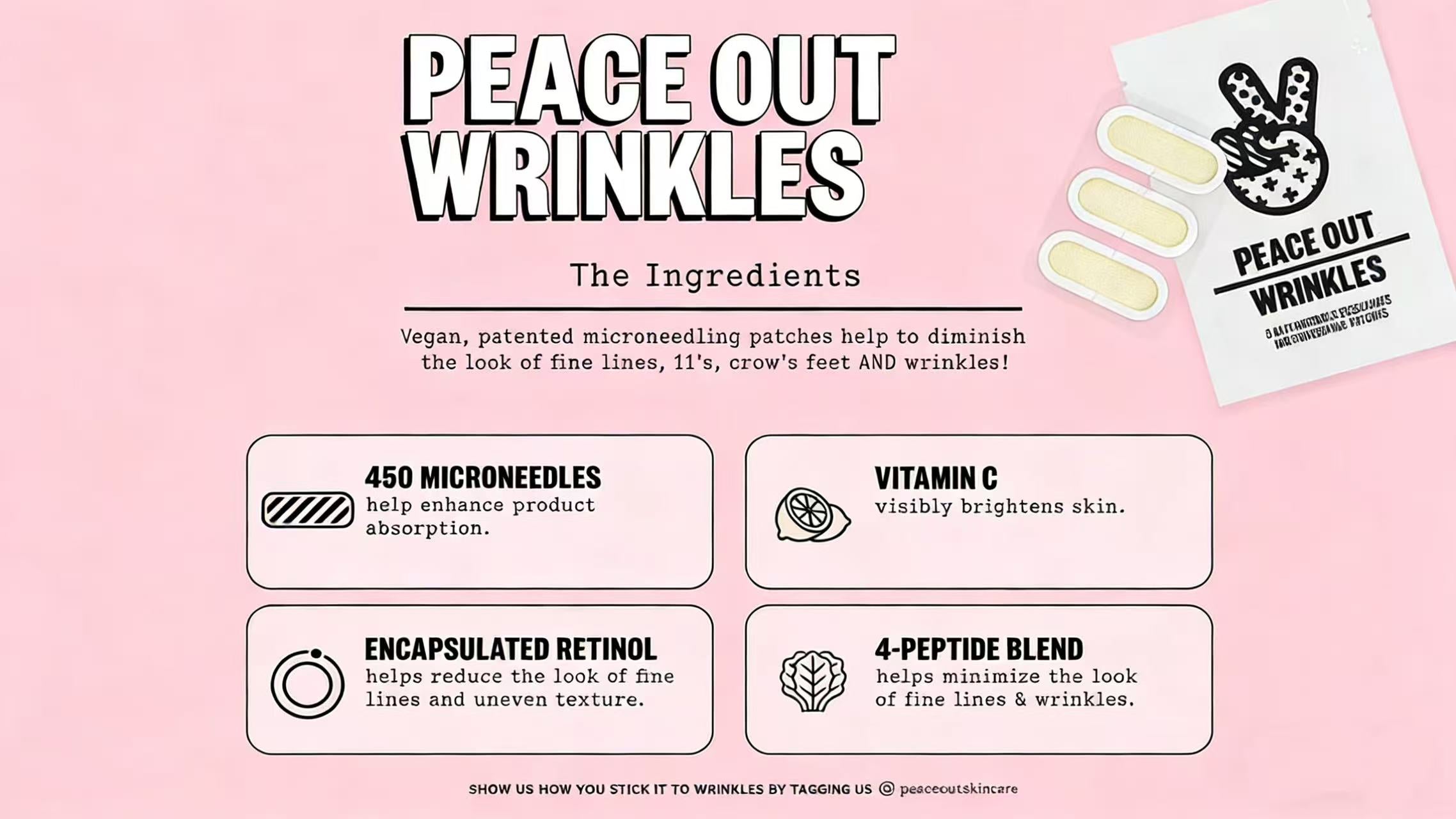 Peace Out Wrinkles is a targeted wrinkle patch treatment designed to help visibly smooth fine lines and wrinkles while you sleep, delivering hydration and wrinkle-care ingredients directly to the skin.